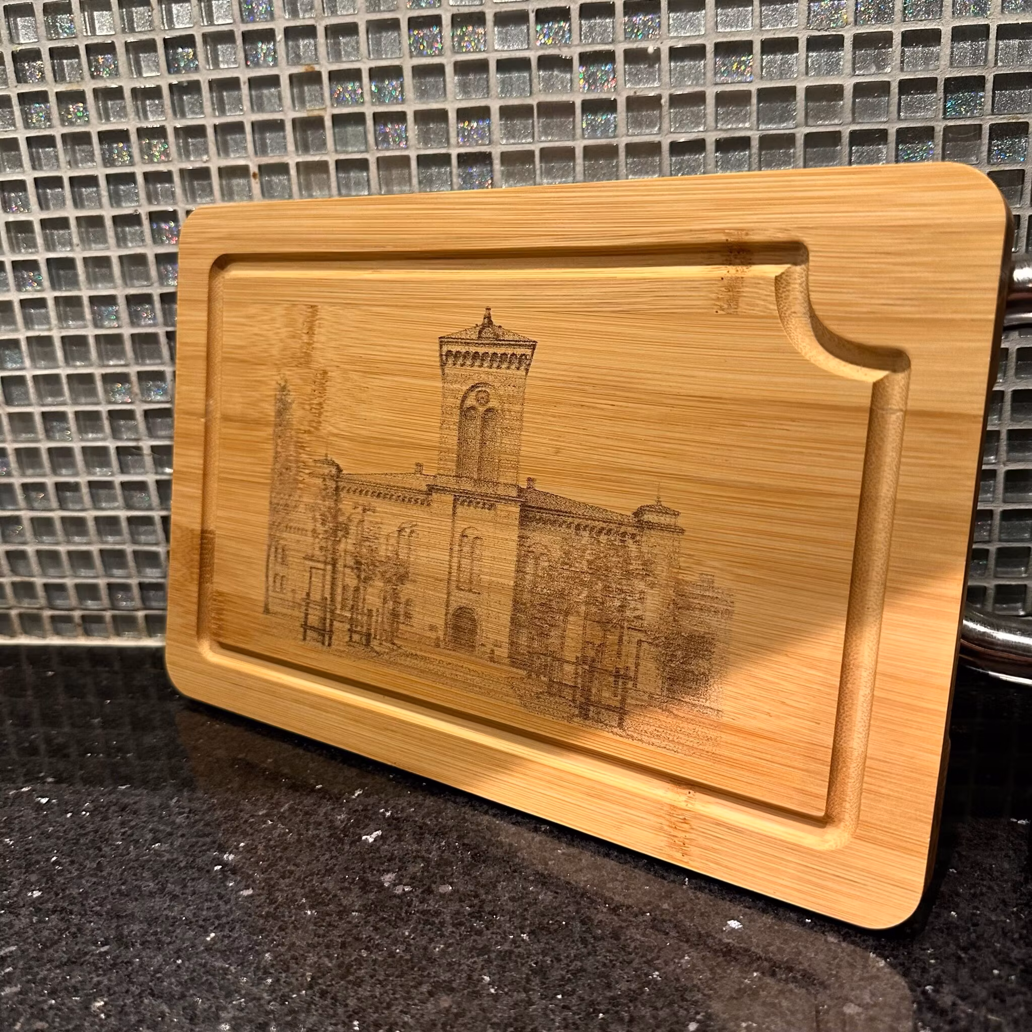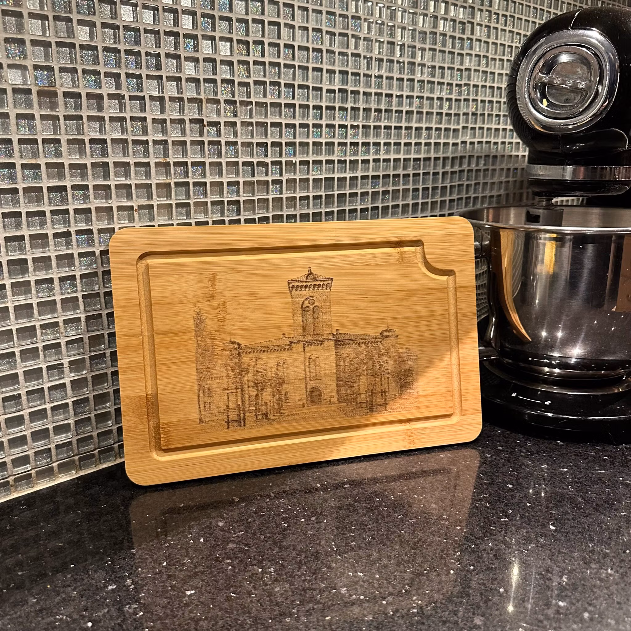 Vacker skärbräda i flera praktiska storlekar, tillverkad av högkvalitativ bambu och graverad med Garnisonkyrkan i Karlsborg. Perfekt som både funktionellt köksredskap och elegant serveringsbräda eller som en stilfull dekoration i köket.