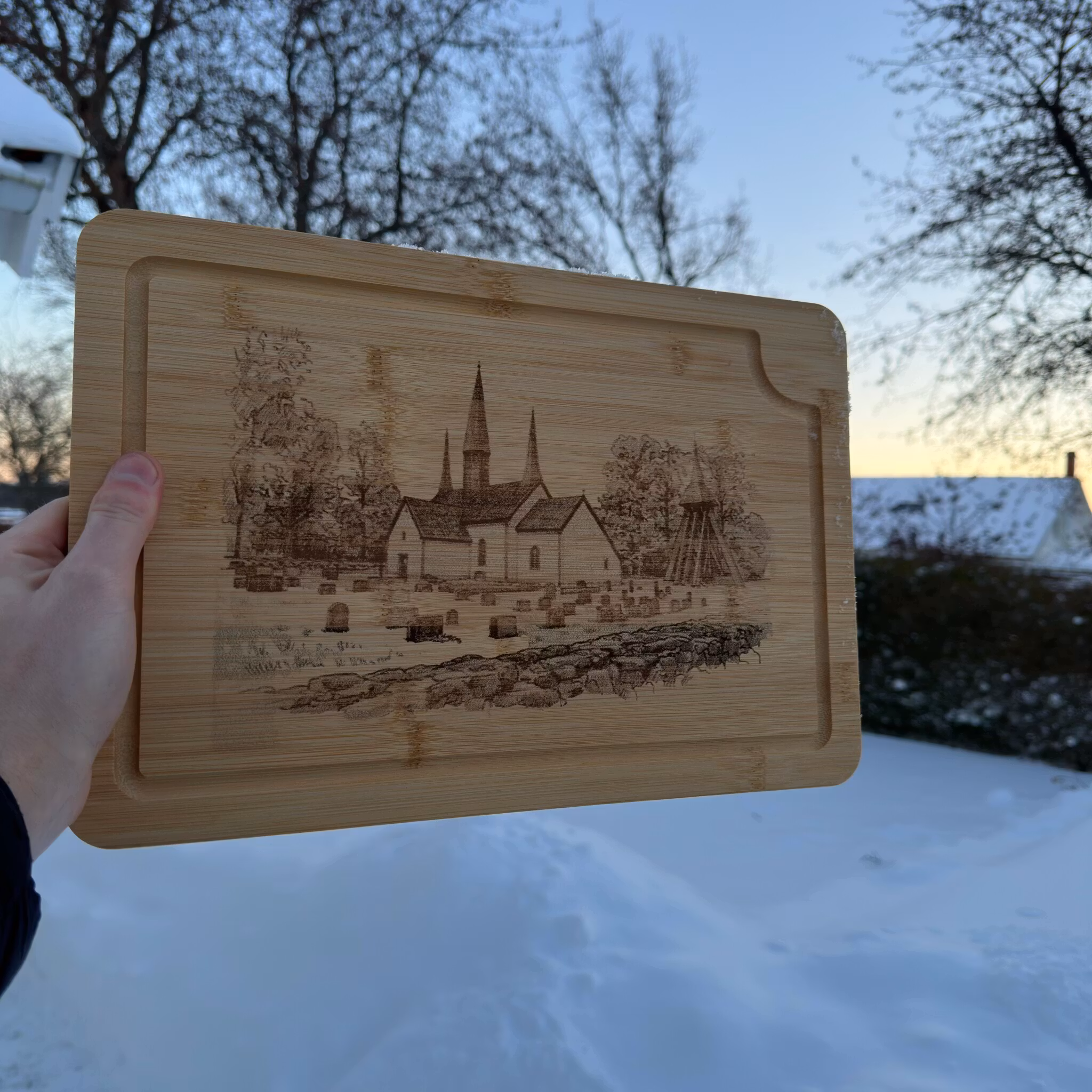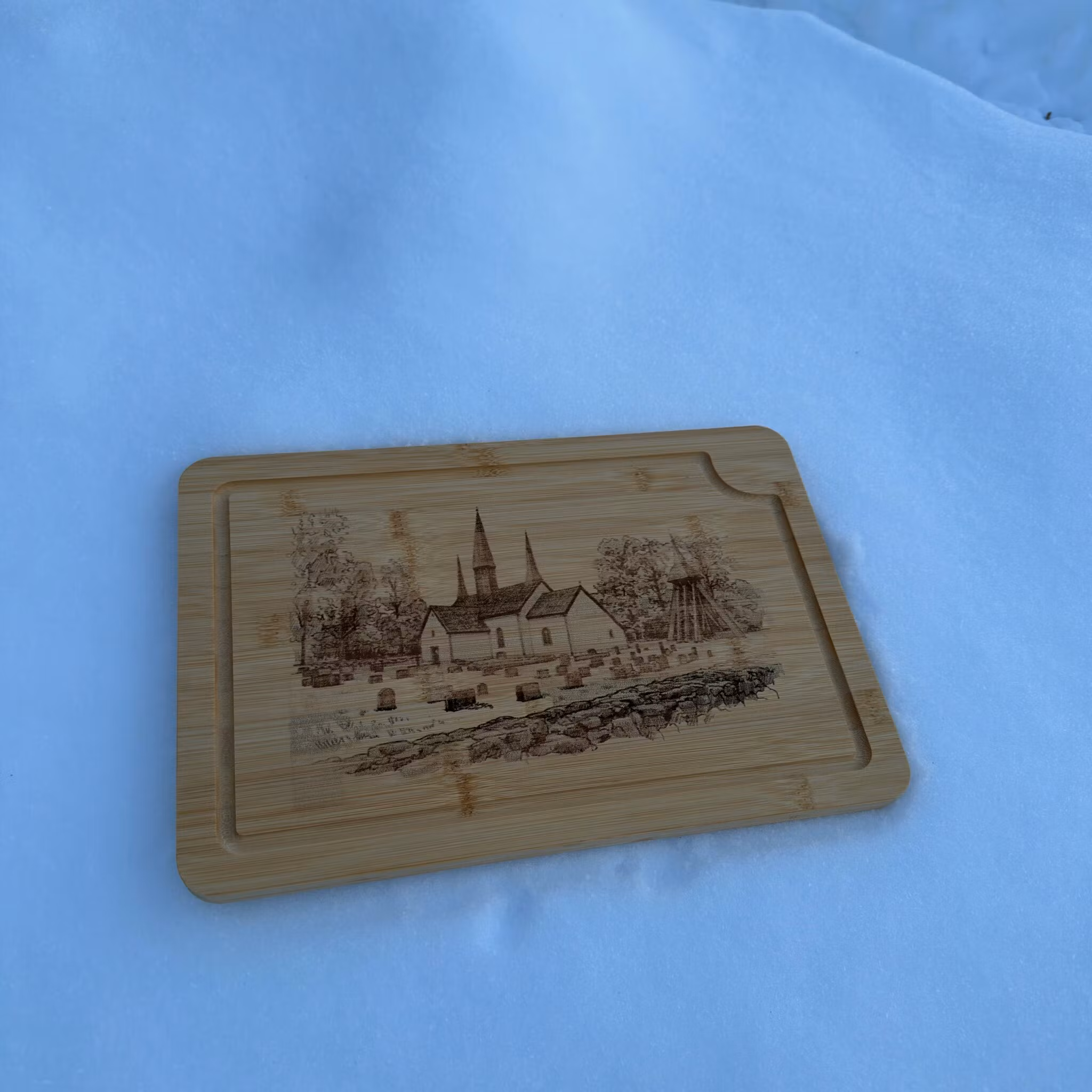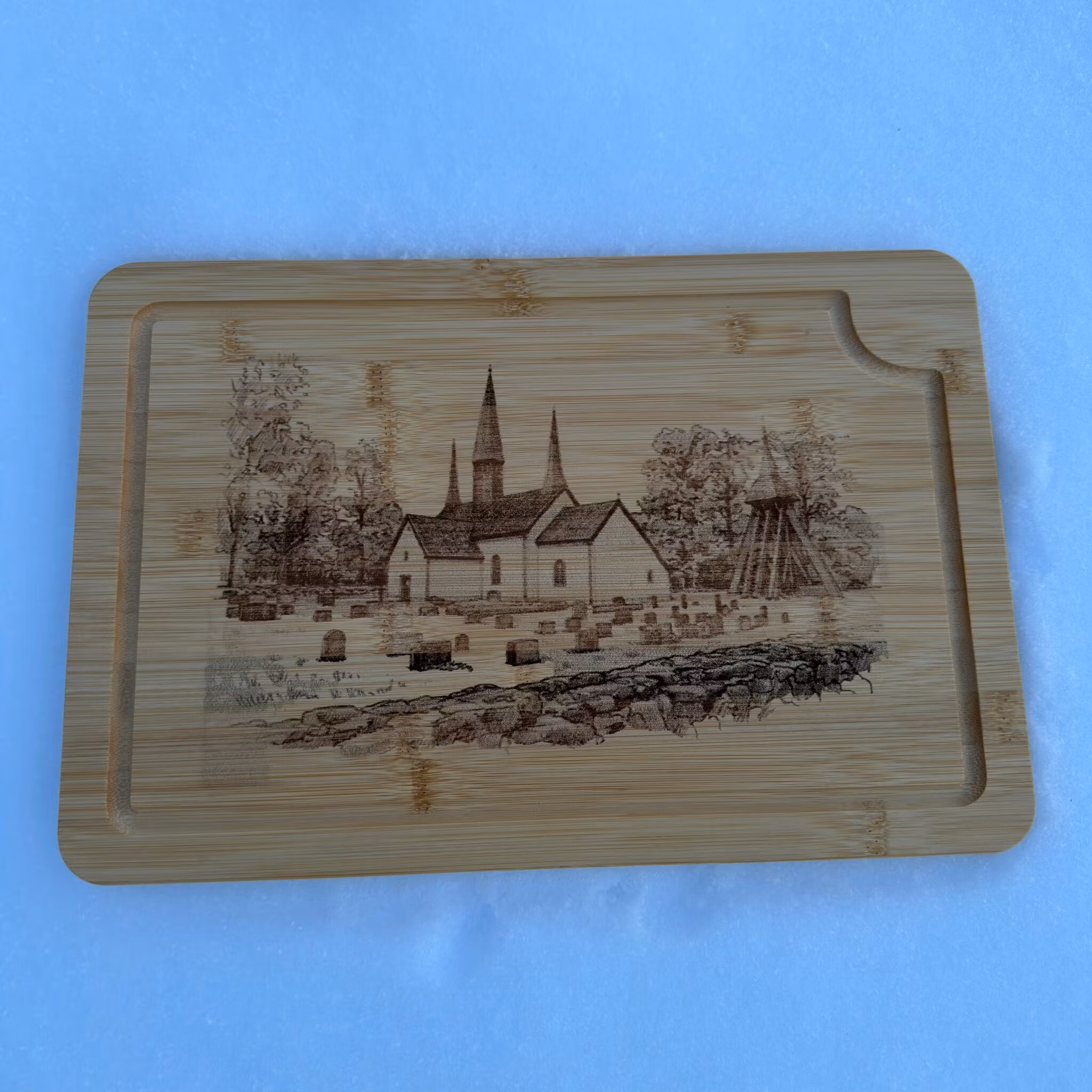 Vacker skärbräda i flera praktiska storlekar, tillverkad av högkvalitativ bambu och graverad med Kungslena Kyrka utanför Tidaholm. Ett tidlös motiv inspirerat av platsens historia och vackra landskap. Perfekt som både funktionellt köksredskap och elegant serveringsbräda eller som en stilfull dekoration i köket.